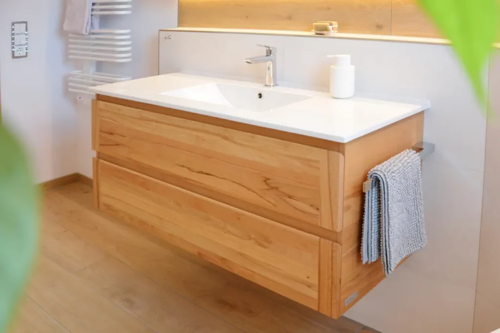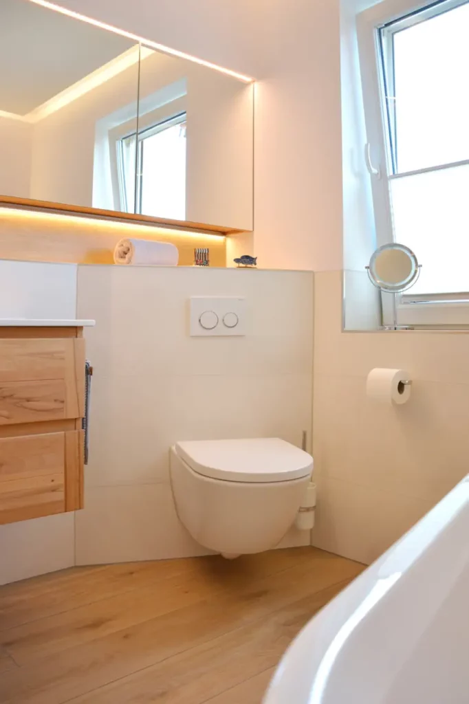 Nützlicher Stauraum befindet sich an der Waschtischanlage. Ein Waschtischunterschrank und ein großer Spiegelschrank, der in der Vorwand eingebaut ist.