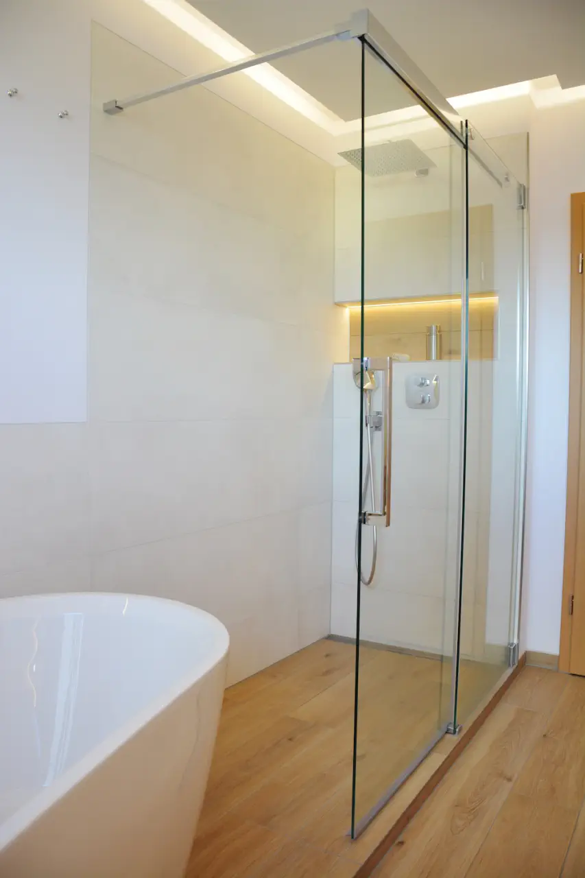 Die Duschanlage ist offen. Um Spritzwasser im Bad zu vermeiden, wurde eine Glas-Schiebetür eingebaut. Die freistehende Badewanne mit Blick aus dem Fenster bietet die Möglichkeit, sich zu entspannen.